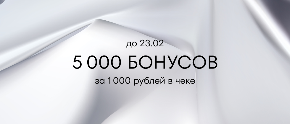 С 23 декабря 2025 г. по 23 февраля 2026 г. включительно начисляем единоразово 5 000 бонусов за 1 000 р. в чеке на покупки себе и близким. Яркие новинки новогодней коллекции и трендовые модели сезона уже ждут тебя!